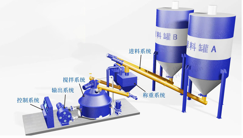 進料系統由多臺螺旋輸送機和稱重罐組成,通過螺旋輸送機將儲存罐里面的散裝水泥,粉煤灰等物料,采用螺旋輸送機定量均勻輸送到稱重罐,稱重后再輸送到特制攪拌罐進行攪拌;
